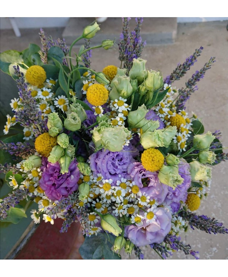 Μπουκέτο με λυσίανθο, χαμομήλι, λεβάντα, κρασπέδια & ευκάλυπτο.